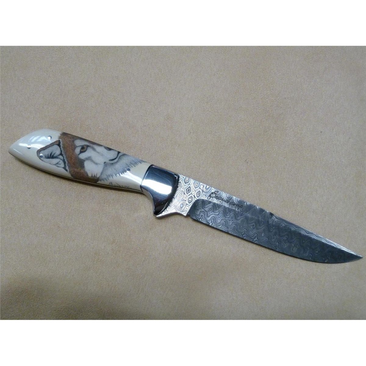 Lot 7 Knife with engraved stainless steel Damascus 9" blade and Mammoth Ivory handle
