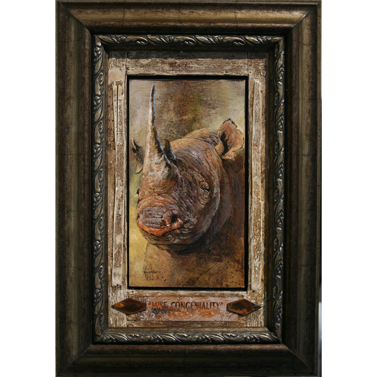 Original Oil on canvas titled "Miss Congeniality" donated by Kobus Möller Studios, LLC. Kobus has spent many years delighting his followers with incredibly beautiful painting depicting majestic scenes of African wildlife, landscape, and culture. With this black rhino, Kobus shows us a more whimsical side. Beauty is indeed in the eye of the beholder! 22" x 18" framed. Donor information: Kobus Moller Studios LLC, Holly Mathew, 281-369-2177, holly@kobusmoller.com, www.kobusmoller.com.