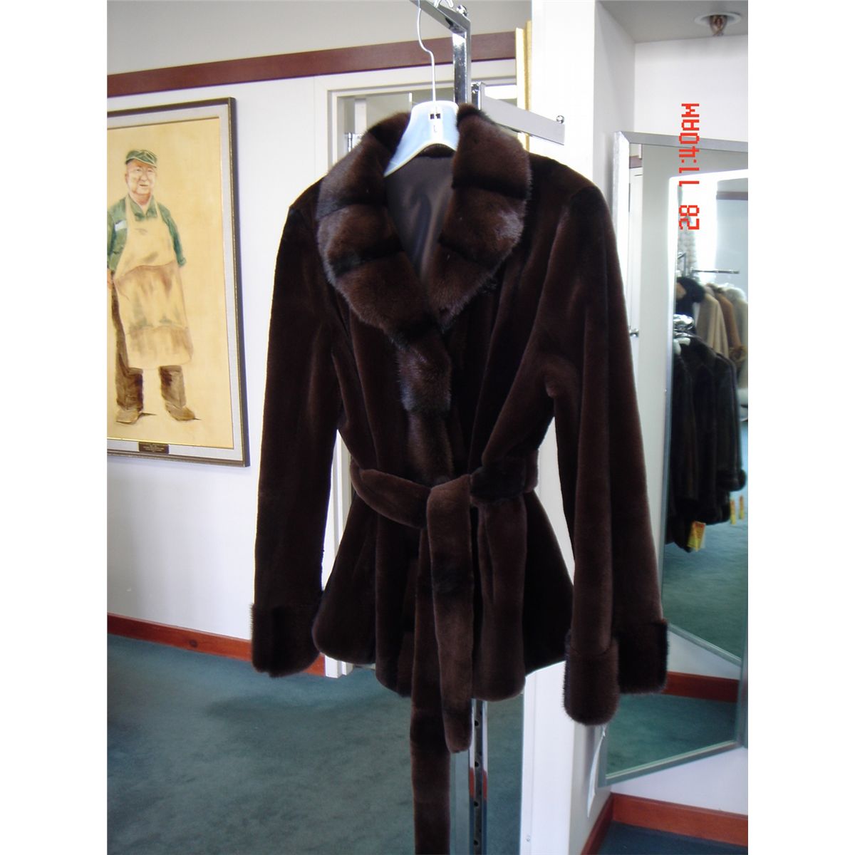 Luscious Brown/Black Sheared Mink Jacket with belt at waist, rich two tone long hair mink accent collar, trim & cuffs. Reversible to bronze rain taffeta fabric. Lightweight and perfect for every day. Dallas Safari Club thanks David Green Master Furrier for this 100% donation. Donor information: David Green Master Furrier, David Green, 907 277-9595, dgsgfurs@aol.com, www.davidgreenfurs.com.