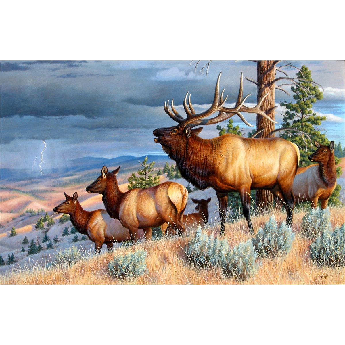 A long time hunting advocate and enthusiast, Cynthie brings her own experiences in the field to life in her detailed paintings. A hunting trip to the Missouri Breaks in eastern Montana inspired this scene of a big bull challenging the coming thunderstorm. Cynthie's art has earned thousands for habitat conservation with awards from Ducks Unlimited, the Rocky Mountain Elk Foundation, and 14 state duck stamps to her credit. Over 125 mounts from all over the world grace her trophy rooms, and she is eagerly anticipating her 15th trip to Africa this summer. Donor information: Cynthie's Wildlife Originals, Cynthie Fisher, 406-375-1445, cynthie@wildlblue.net, www.fisherart.com.