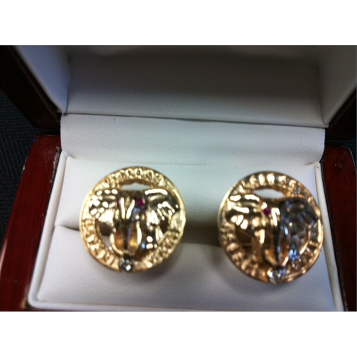 Custom made Dallas Safari Club men's cufflinks in 14k yellow gold with ruby eyes and a 0.02 ct. TW diamond. Dallas Safari Club thanks Tim the Jeweler/ By Avanti, L.L.C. for this 100% donation. Donor information: Tim the Jeweler/ By Avanti, L.L.C., Tim Lee, 770-335-4939, tlavanti@gmail.com, www.ByAvanti.com.