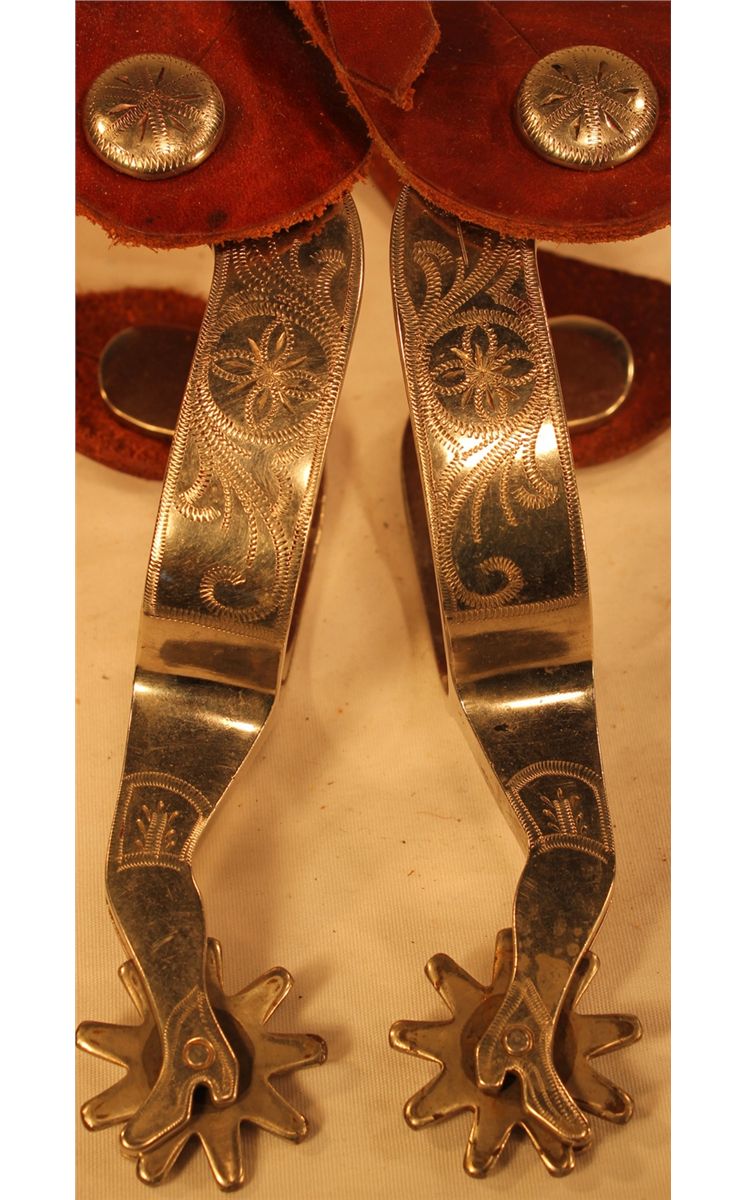 Crockett Gal Leg Spurs; A nicely marked pair of Crocketts, engraved on one side and nickel plated, and remaining in very nice condition.