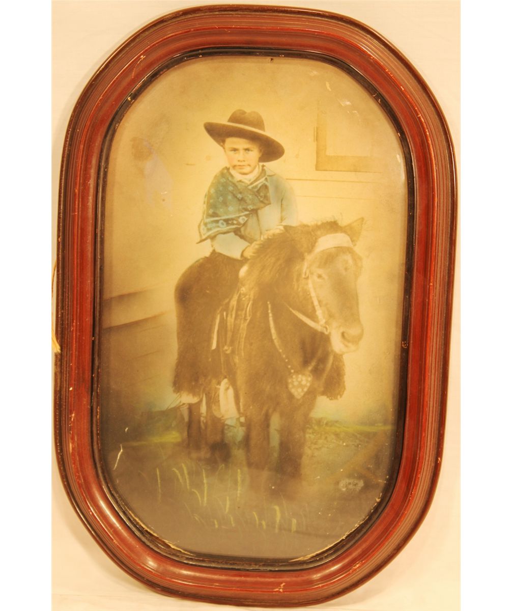 Great Vintage Photograph of a little cowboy on his horse in a wonderful original bubbleglass frame.