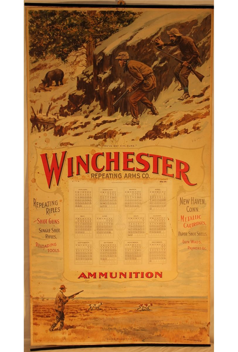 Winchester Advertising Calendar; A great pictorial image, retaining its original bands on top and bottom, having had the calendar pages removed and in fair condition. 14"x 26".