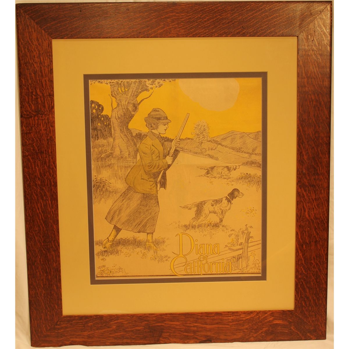Framed Artwork "Diana of California"; a rare image of a woman hunting with her dog. Framed in a wonderful original oak frame, measuring 27"x 30".