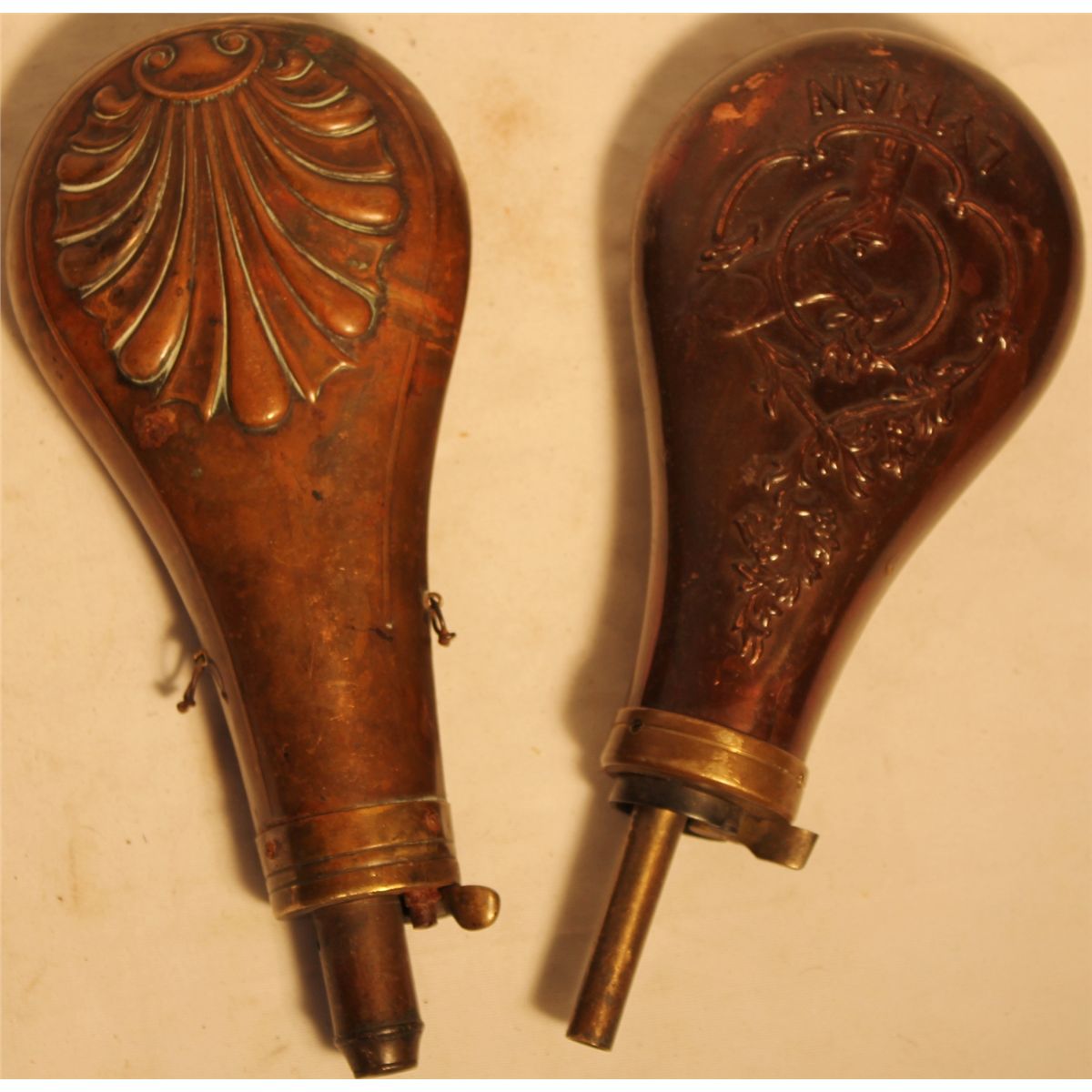Lot of 2 Powder flasks; both made of copper and brass, one maker marked "Lyman" with a pictorial scene of a deer, and the other embossed with a decorative design.