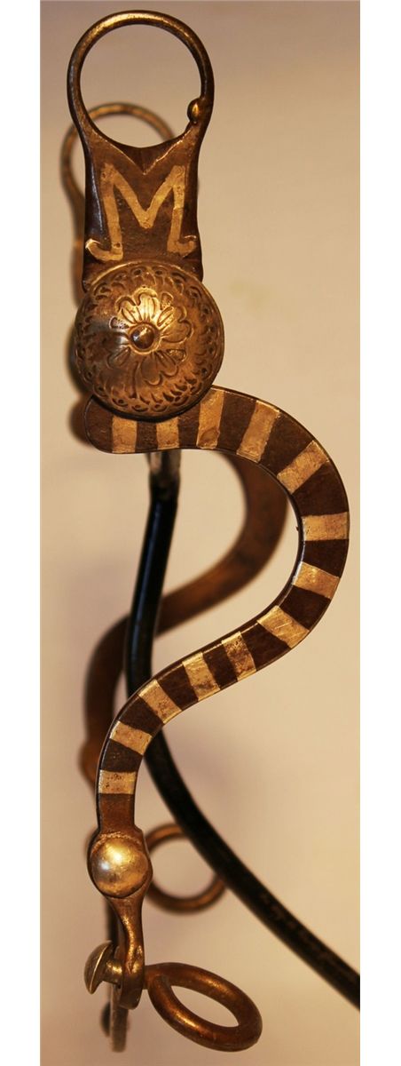 California Style "S" Shank Bit; a beautiful early "S" shank bit, with 1" conchos and silver inlaid chevrons down the shanks and across a nice lipbar.