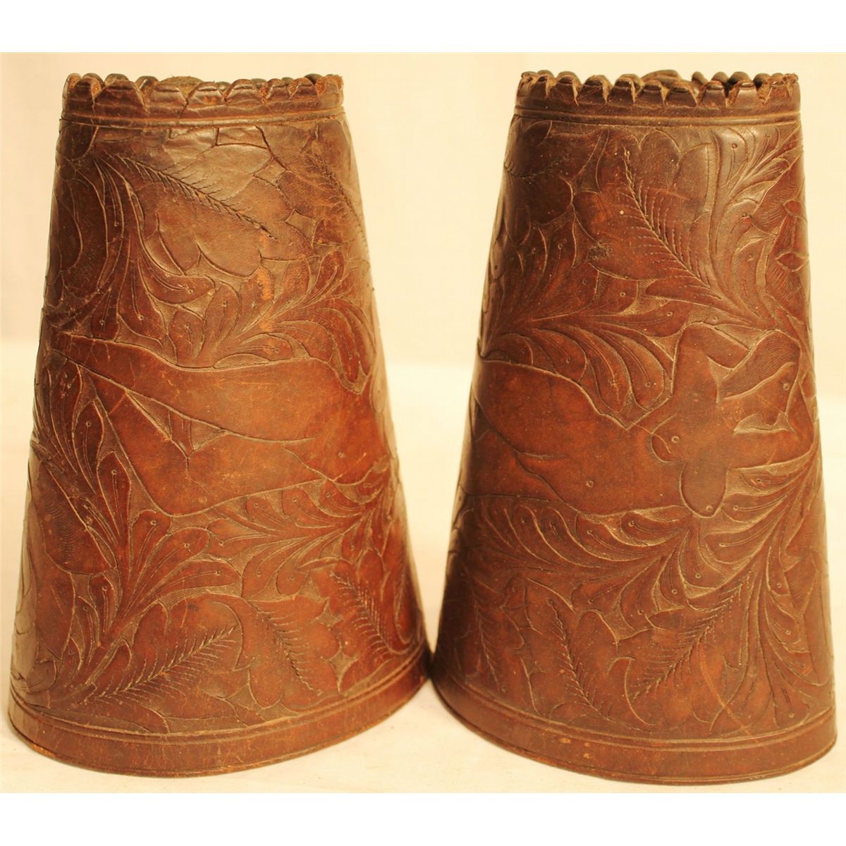 Fully Tooled Wrist Cuffs; an elaborate pair of unmarked cuffs tooled with Victorian nude ladies, being supple in condition and light color.