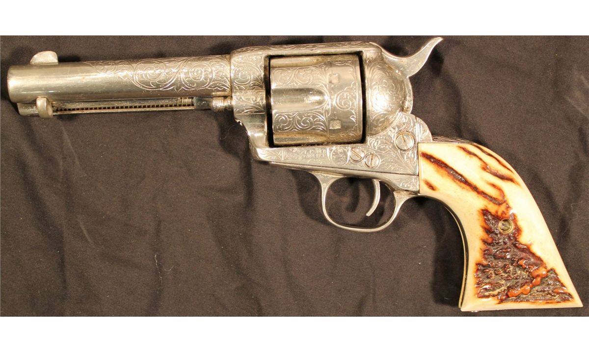 Engraved Colt Single Action Revolver; a great looking example of a cowboy six shooter. A 45 caliber with a 4" barrel, and stag grips. Antique serial range (#153539), period engraved and nickel plated, showing 90+% of its finish as refinished long at some time.