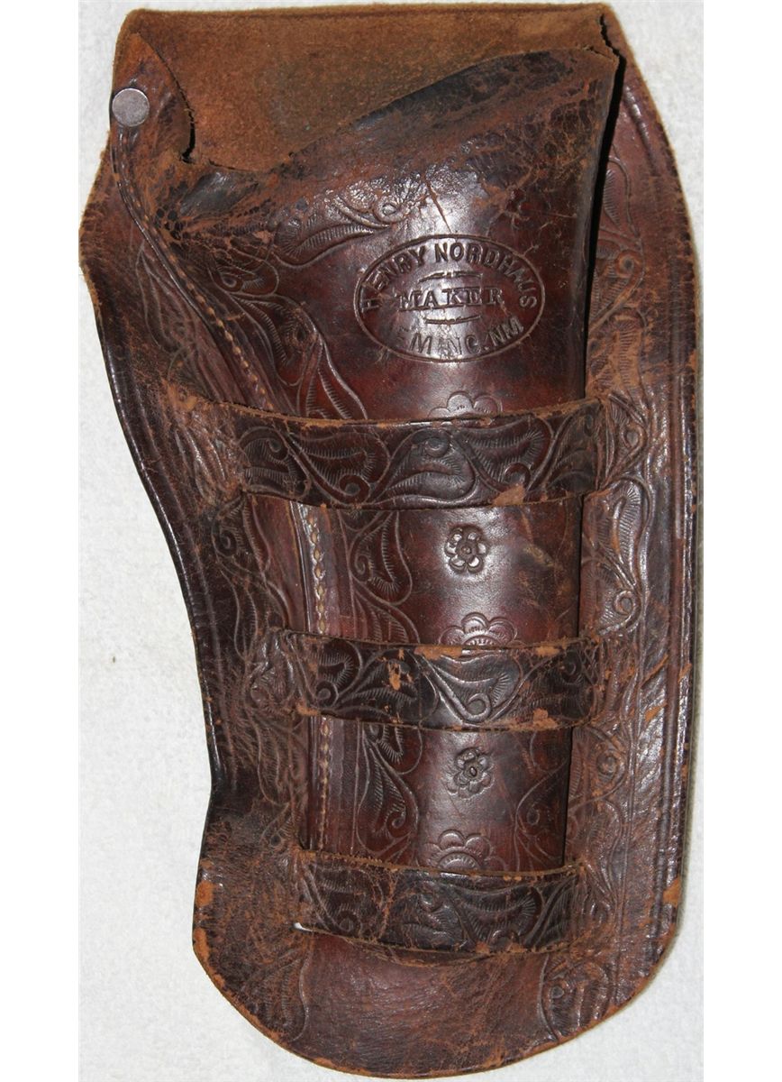 Henry Nordhaus, Deming New Mexico Triple Loop Holster; a very sought after maker, made for a 7 1/2"Colt single action, a well marked fully tooled holster in light color and great condition, but having been slightly trimmed at the muzzle and skirt.
