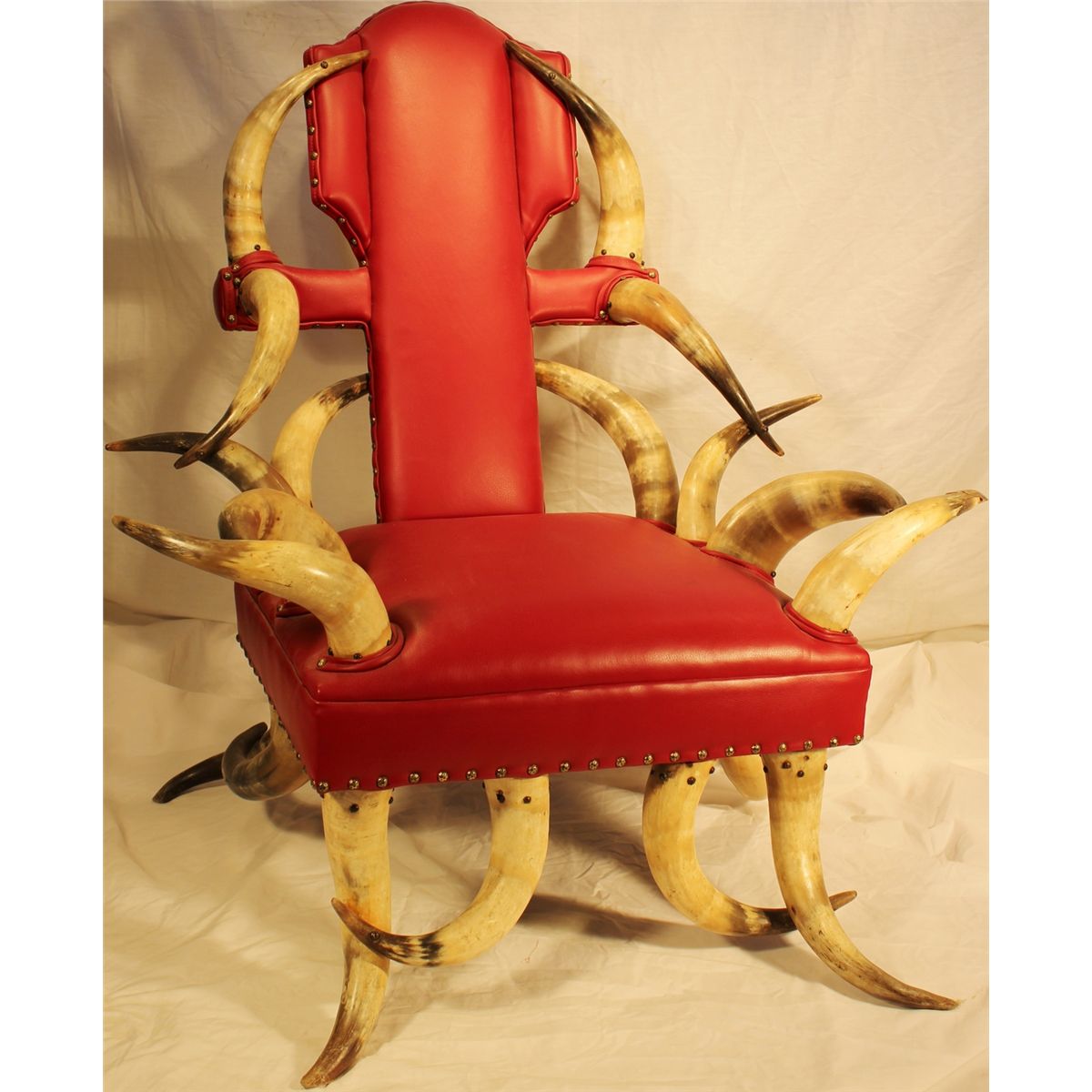 Large Horn Chair; freshly reupholstered with a great looking red leather, and nice patina to the horns, giving it great presence.