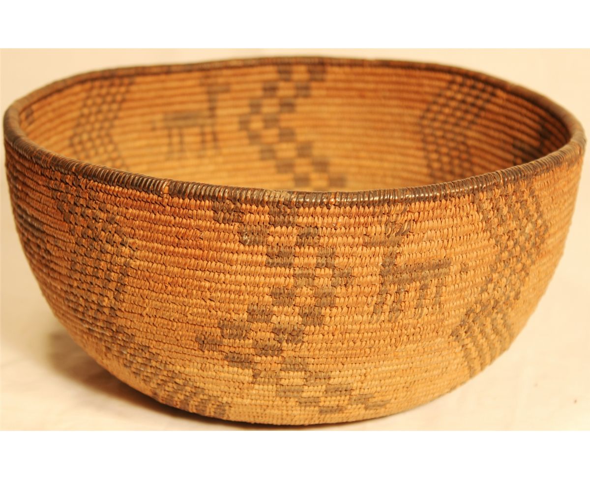 Unusual early Apache bowl basket; with horse figures and a unique spiral zig-zag figure, large in size measuring 9 1/2" across 5" high.