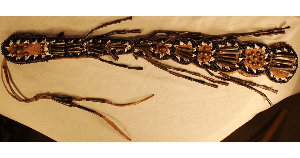 Plains awl case with scalloped design, fully decorated with beadwork, brass studs and many tins cones. In beautiful original condition. Measuring 20"x 3". ca1890