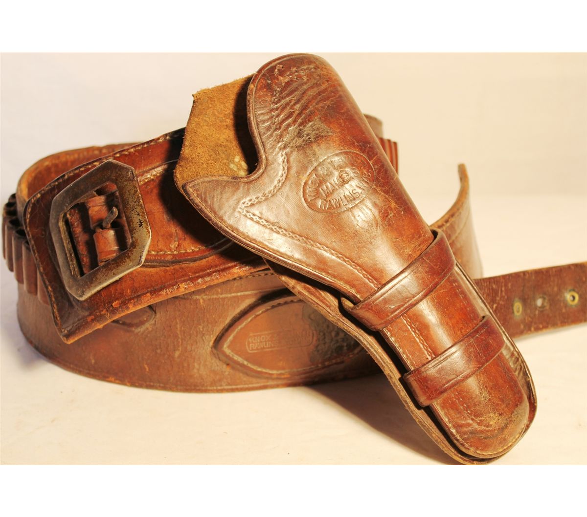 Knox and Tanner Rawlins, Wyoming Holster and Money Belt; an extremely desirable early Wyoming gun rig. Holster and belt each being well marked. A double loop holster made for a 5 1/2" Colt single action, extra wide money belt measuring 3 1/2", and having cartridge loops for 38 caliber. Showing nice condition and light russet color. As a reference; a similar gun rig sold at Little Johns in 2010 for $11,500.
