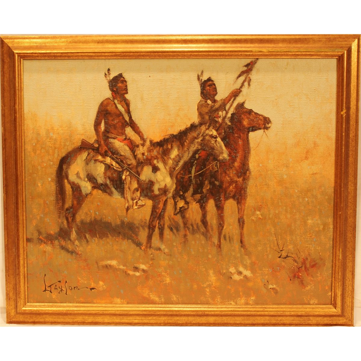 Lyle Tayson oil on canvas of Indian braves. Signed lower left. 19 1/2" x 15 1/2.