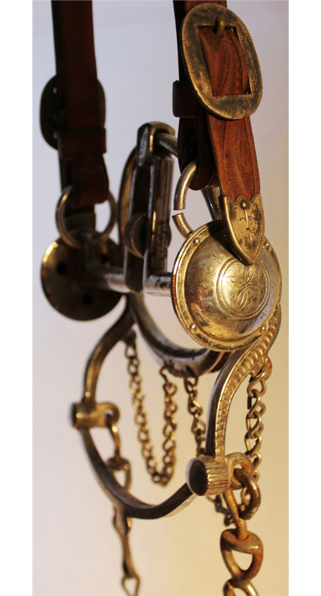 Mint Buerman Ring Bit; an early unused bit with 2" conchos, a smiley face on the port, a beautiful ring and all original chains. Accented by a full flower tooled silver mounted two- ear bridle.