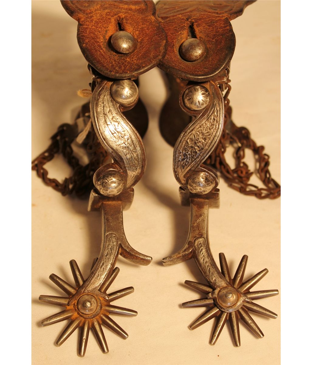 GS Garcia Silver Spurs; an uncommon single inlaid pattern with an attractive scalloped heelband and domes, well marked, and having 2" rowels . With original straps.