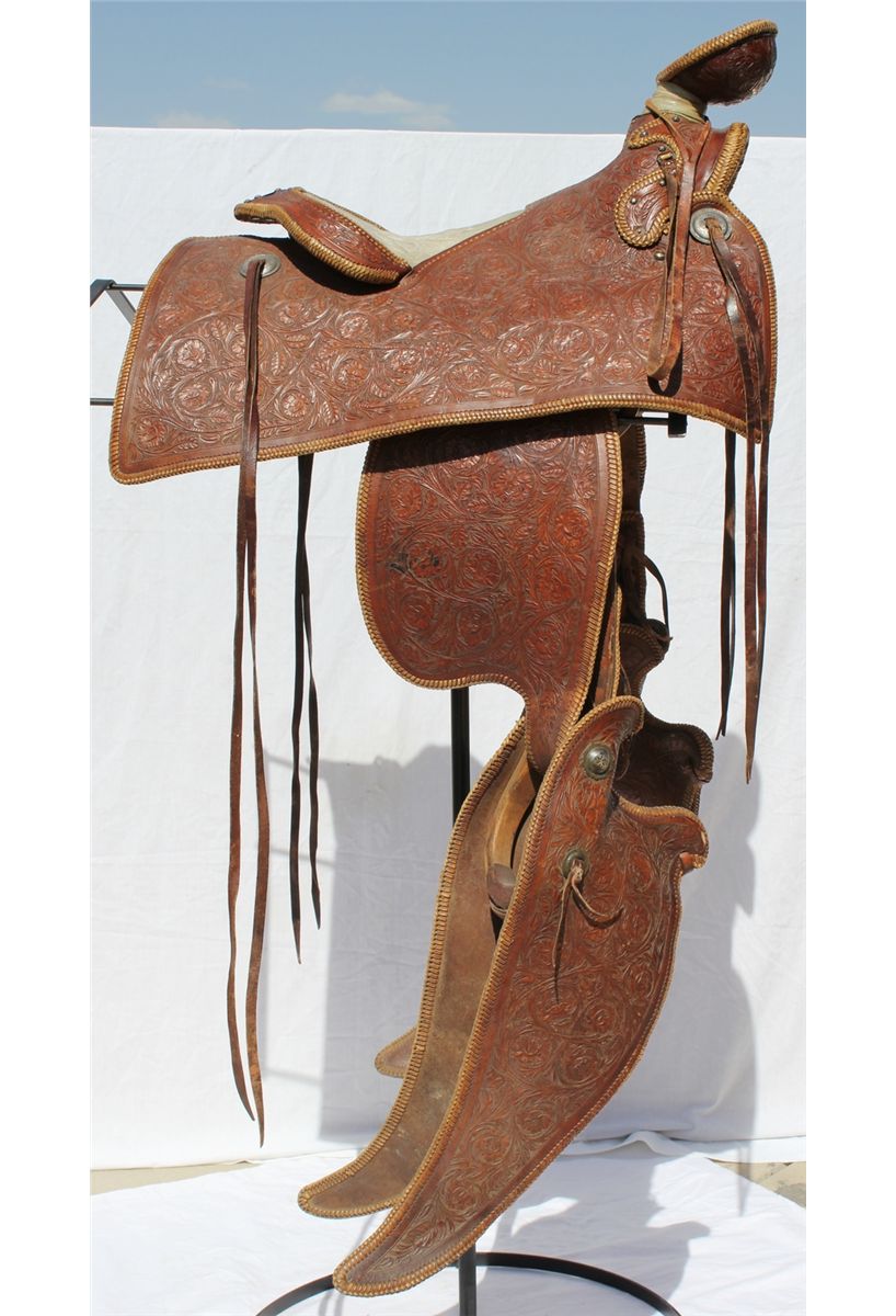 Gene Sisco Saddle; an amazing work of art. Mint and unused. Gene made this saddle for his sister Sammy Sisco, as the silver cantleplate is engraved "SOS". A mother hubbard style that is tooled like a masterpiece, with 27" tapaderos, hidden pockets under the skirts, sterling conchos and 16" seat. The Sisco family were master leather toolers for Visalia and Olsen Nolte.