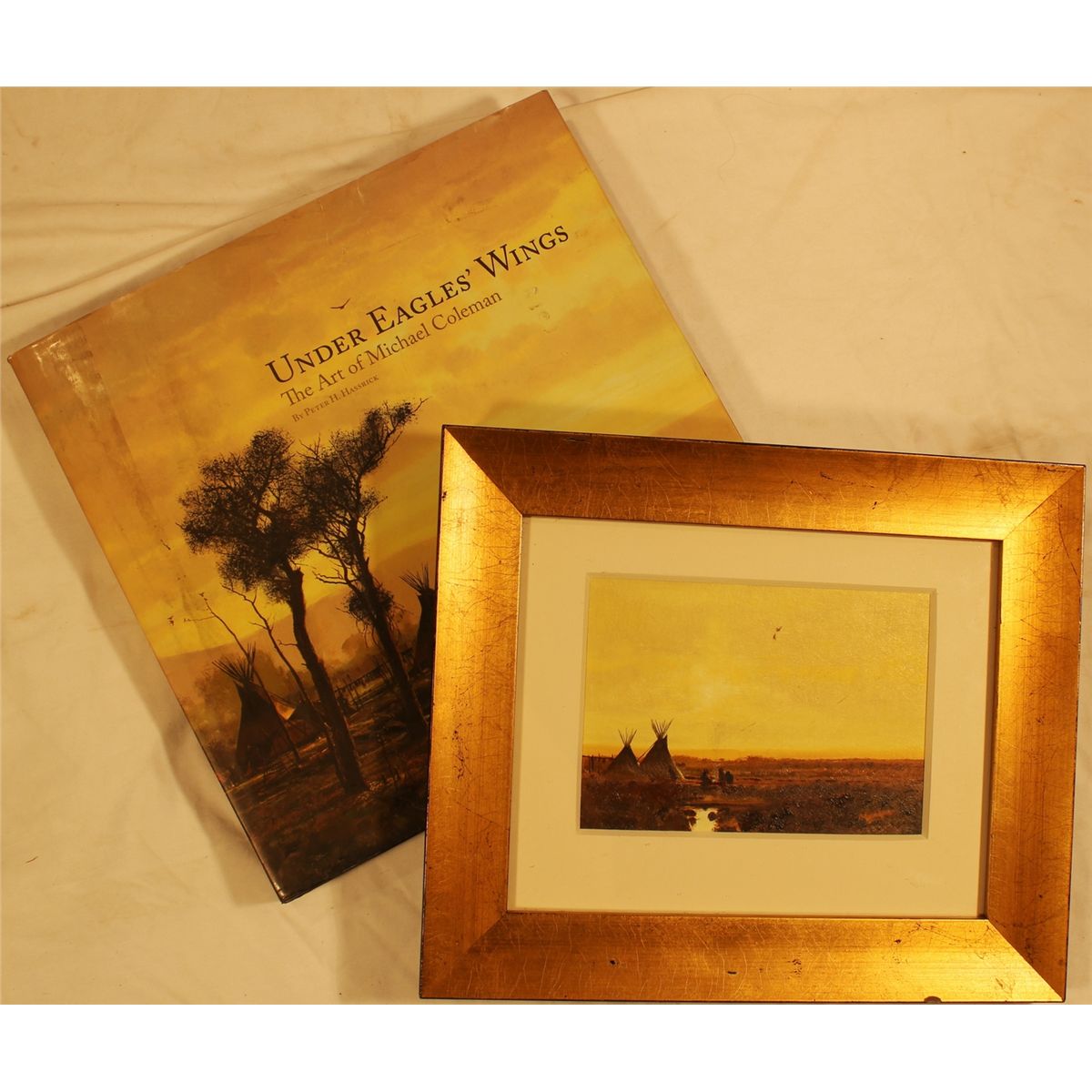 Michael Coleman oil on board of Indian Encampment 5" x 7". With copy of Under Eagles Wings book by Peter Hassrick.
