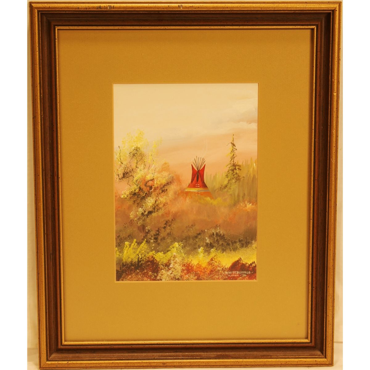 White Buffalo Kiowa tribal member signed 1975 watercolor of teepee. 10 1/2" x 7 1/2"