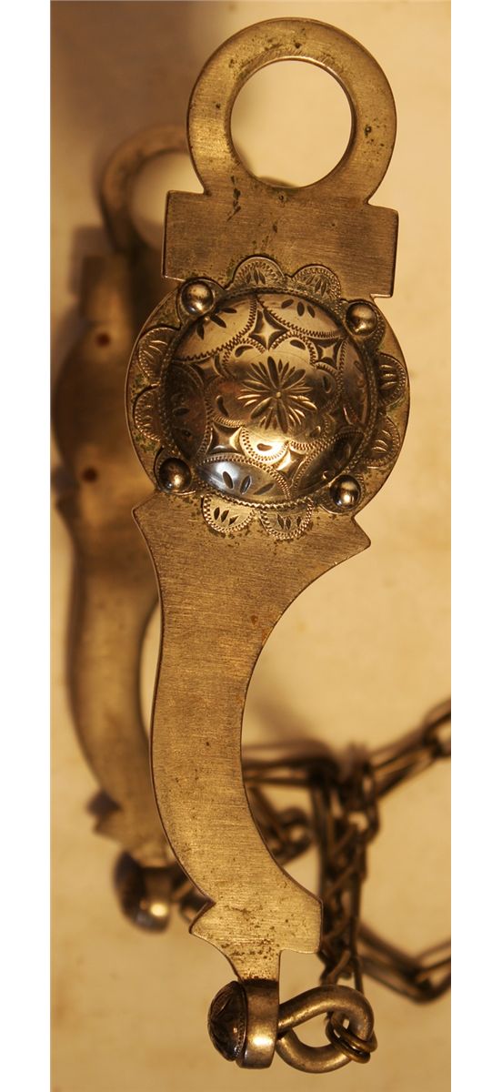 Gutierrez Halfbreed Bit; a minty bit, with nicely engraved scalloped 2" conchos, well marked with the La Conte address, and original chains.