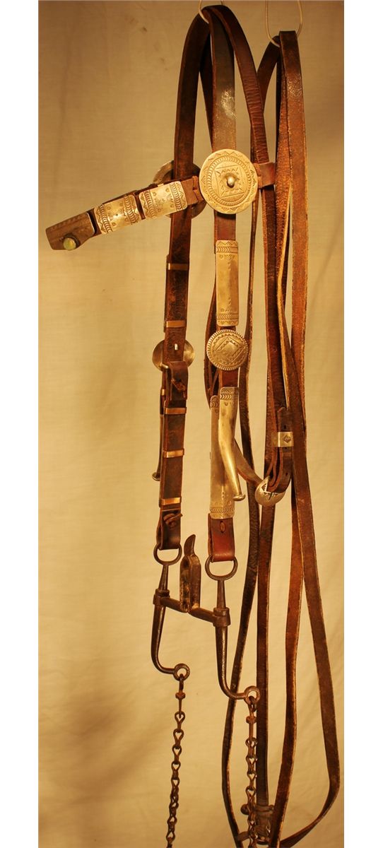 Navajo bridle with full silver work and unique old Mexican swivel spade bit. Has turquoise stone in the brow band.