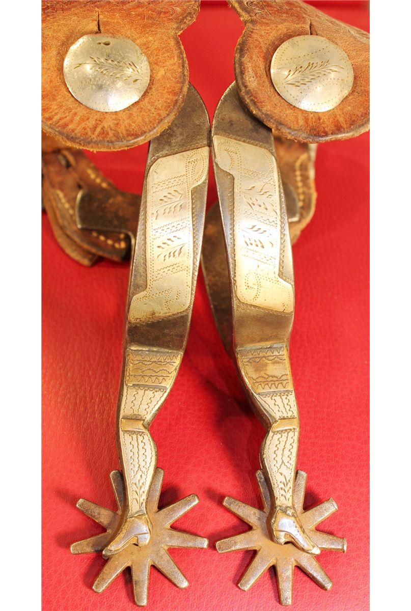 Kelly Bro's Lady Leg Spurs; single mounted with brass and silver, remaining in very nice condition, with 1 1/2" rowels.