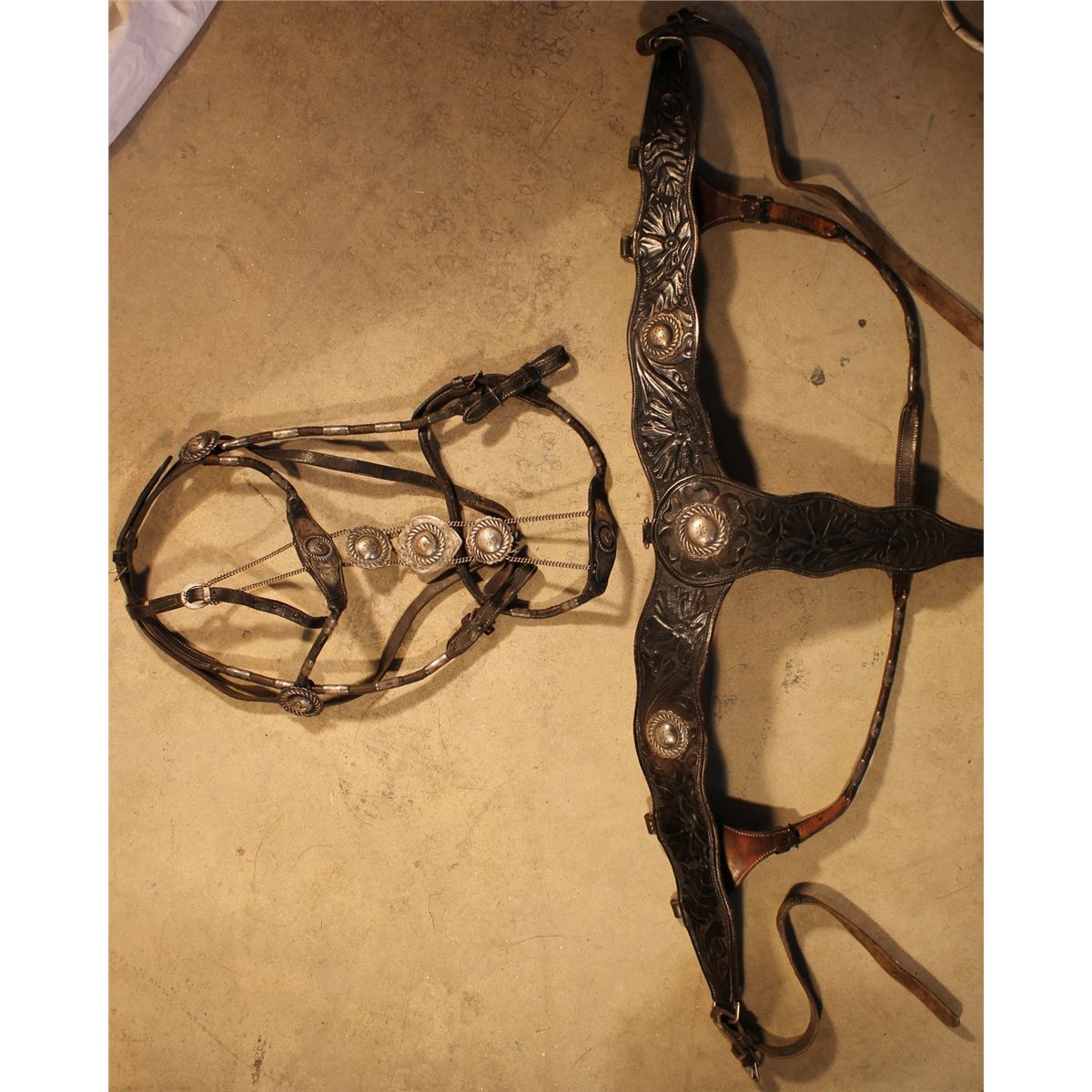 Keyston Bro's Headstall and Breast Collar; black full flower tooled, with beautifully engraved scalloped conchos and with gold horseheads, bridle having a great face chain with a shield center.