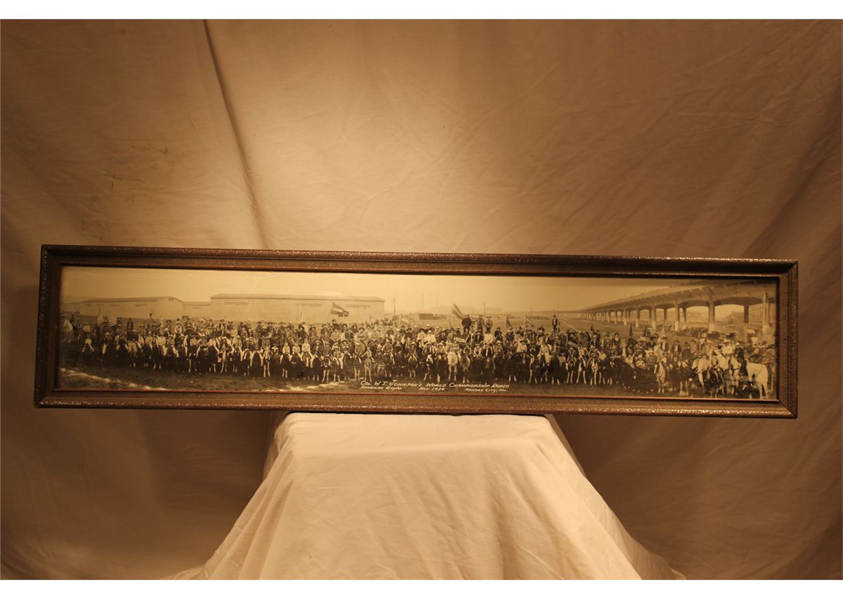 Panoramic Photo of W.T. Johnson's American Royal World Championship Rodeo, dated 1934. A great photo filled with performers and contestants. 8 1/2" x 40 1/2".