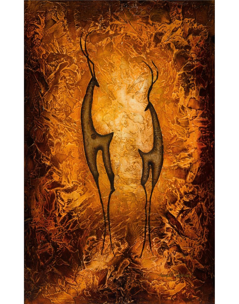 Donation: This painting depicts a stylized cave drawing of a horned animal, each having individual ancient symbols embossed onto its body; each individual symbol represents his or her life experience. Additionally, they each also have identical matching symbols representing events they have shared together creating shared memories.