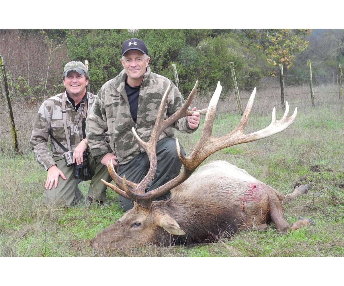 This is a 6 day fully guided 1x1 hunt for one hunter for one tule elk bull on the Jim Bardin Ranch in Monterey County CA with Guide/Outfitter Donald C. Martin and ranch owner Bob Swanson. This hunt is an excellent opportunity to harvest a trophy class tule elk on 8,000 private acres only minutes away from Monterey. Past hunts have been 100% opportunity for rifle and muzzleloader hunters. Method of harvest is hunter's choice, though rifle is recommended. Only two bull tags are issued to the ranch through California Fish and Wildlife's Private Land Management program each year. Hunting pressure on the ranch is very light and bulls are allowed to grow to their true trophy potential. For out of state hunters, this hunt includes airport pickup and drop-off at Monterey Peninsula Airport. CA hunters will be provided with driving directions to the ranch. Not included are: commercial airfare, CA hunting license, commercial meat processing, taxidermy, shipping fees for meat/trophies, and gratuities.