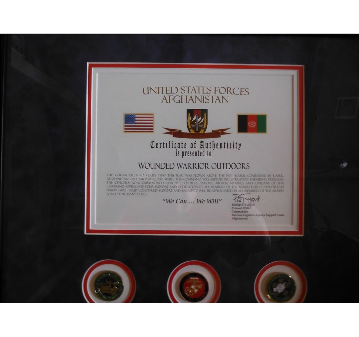 Donation: This flag of the United States of America was flown in the face of the enemy over Bagram Airfield, Afghanistan on the 3rd of July, 2005 during Operation Enduring Freedom VI. It was flown in honor of your dedication, commitment, and noble support of those who proudly serve in the Armed Forces of the United States during the Global War on Terrorism. This reflects greatly on your valorous patriotism as American Citizens. Certificate of Authenticity is signed by: Bagram Airfield CSM Timothy Green and Col. & FA Commanding Officer Robert Algermissen. Proceeds of this USA Flag benefit WSF and the Wounded Warrior Outdoors.