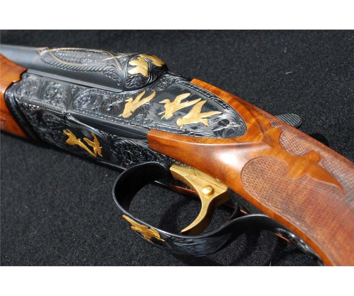 Donation: This beautiful Pachmayr/Winchester shotgun was customized and upgraded by Frank Pachmayr. Custom side plates totally engraved with 14qt gold inlays. Barrel is engraved at chamber & muzzle areas, custom stock & beaver tail forend with Fleur de lis checkering.