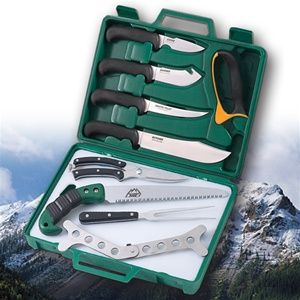 The most complete 12-piece set in a hard side carry case. The set includes: a caping knife, a gut-hook-skinner, a boning/fillet knife, a bowie style knife, a full-size cutting board, a triple ground wood/bone saw, a carving fork, heavy duty game shears, a steel stick brisket spreader, game cleaning gloves, Tungsten Carbide V sharpener and a hard-sided carrying case. The Eastern Chapter Wild Sheep Foundation custom logo etching is included on the knives.