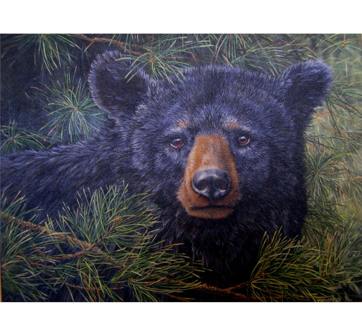 The fourth oil on canvas piece in the "Watcher in the Pines" series depicts a black bear watching from the edge of the forest. Size: 16"x20"