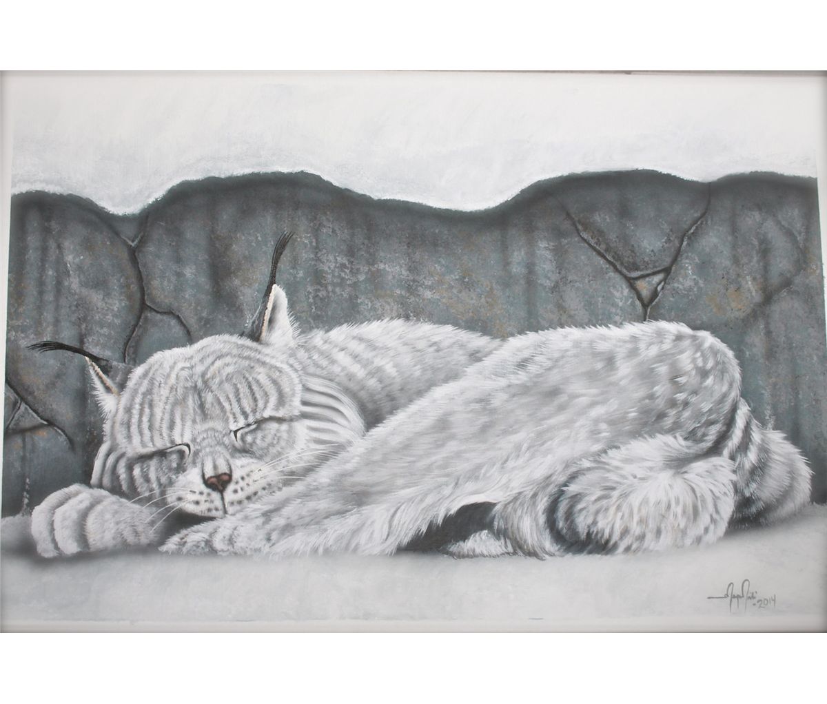Inspired by the Rocky Mountain lynx, this painting gives the onlooker a sense of comfort and peacefulness. I wanted to capture the soft textures and flowing colours of black and grey within the lynx fur with each of my brush strokes. The lynx, among many of the northern wildlife in the Rockies, is considered a predator. Living mainly on rabbits, squirrels and birds, this large tom takes a quick purr cuddled in a furry blanket of grey after his everyday hunt for dinner.