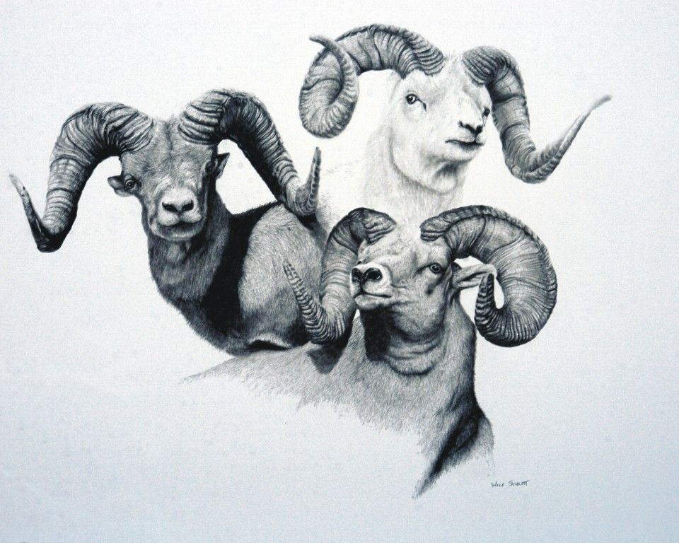 2 x 30 pencil drawings of Dahl, Stone and bighorn ram busts.