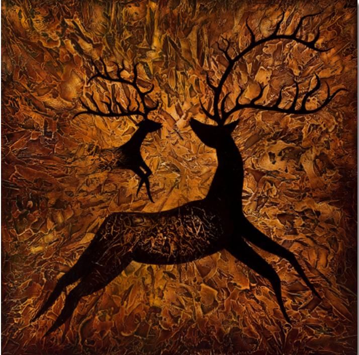Medium: Giclée Print, Custom Frame, 36x 36”. “Out Of Nowhere” Original Is Not For Sale This Giclée has never before been offered. It is signed by the artist and designated as the “Artist’s Proof”. “Out of Nowhere” is a primitive stylized cave art painting by artist Laurel Barbieri. It was inspired by an early hunting experience Laurel encountered while hunting Elk in the Hells Canyon area of North East, Oregon. Walking in the footsteps of the Nez Pierce Indians and seeing their markings hundreds of years later on the old growth Ponderosa Pines, Laurel says, “It makes my heart pound harder, with a feeling of reverence, and is quite spiritual. It can be overwhelming when I am walking in the footsteps of ancient Indians who lived off these lands centuries ago. It’s not only a spiritual awareness it’s also one that fills me with a sense of privilege, as I am one of only very few who will ever know this land, and these animals, in the special way I have come to know them. Here, Rocky Mountain Elk can be seen miles away, in herds of thousands as they bed down in the morning sun atop an opposing ridge. So far away, they are oblivious to our presence, or they can surprise you and come running, right out of nowhere, to cross the meadow you are quietly approaching.” Having never taken an art class, these events are what inspired Laurel to pick up a brush and paint this image, her version of cave art. It was this painting that started Laurel’s art career ten years ago. Today Laurel is internationally recognized and has collectors worldwide. Laurel says she took the Original “Out of Nowhere” Painting to her first show at SCI in 2009. She says “I felt so sick when SCI members showed an interest in buying it and I knew then that I couldn’t sell it, it was just too special” Out of Nowhere now hangs proudly in her Portland home where she says her eldest daughter has spoken for it already, asking if she could have it one day, so that it can be passed on as a family treasure.