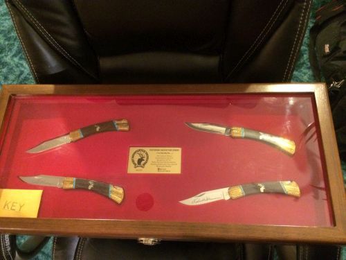 Highlight your collection with this fabulous set of four knives from Heritage Collectibles/Housewares showcasing the acid-etched signatures of the Elk Foundation’s four founders, Robert Munson, Bill Munson, Dan Bull and Charlie Decker, on mirrorpolished Buck #110 blades. The knives are created by world-famous Navajo artist David Yellowhorse, who has carefully cut the Elk Foundation’s official logo from German silver and inlaid it into desert ironwood. These ironwood handles are strikingly accented by turquoise strips which add distinction to this fabulous set. The knives are displayed in a handsome case of walnut lined with luxurious red velvet contoured to cradle each knife, and a brass identification plate is embedded in the center of the velvet.