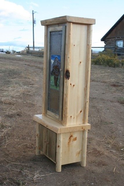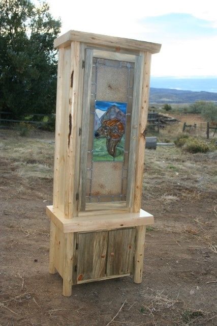 ONE OF A KIND LOG GUN CABINET - HANCRAFTED WITH A WILD SHEEP STAIN GLASS DOOR