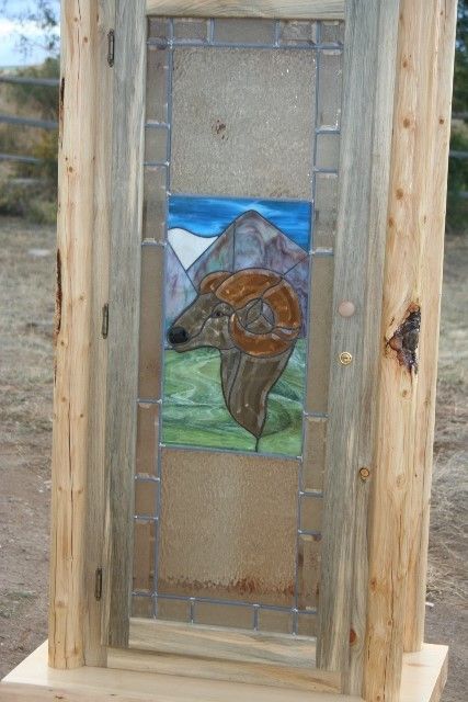 Lot 13 ONE OF A KIND LOG GUN CABINET - HANCRAFTED WITH A WILD SHEEP STAIN GLASS DOOR