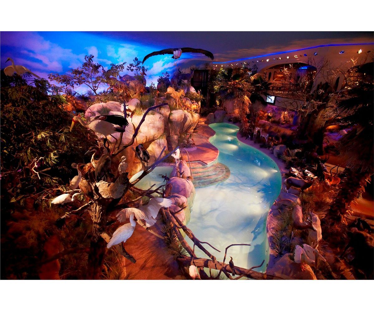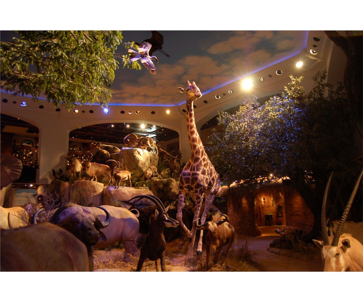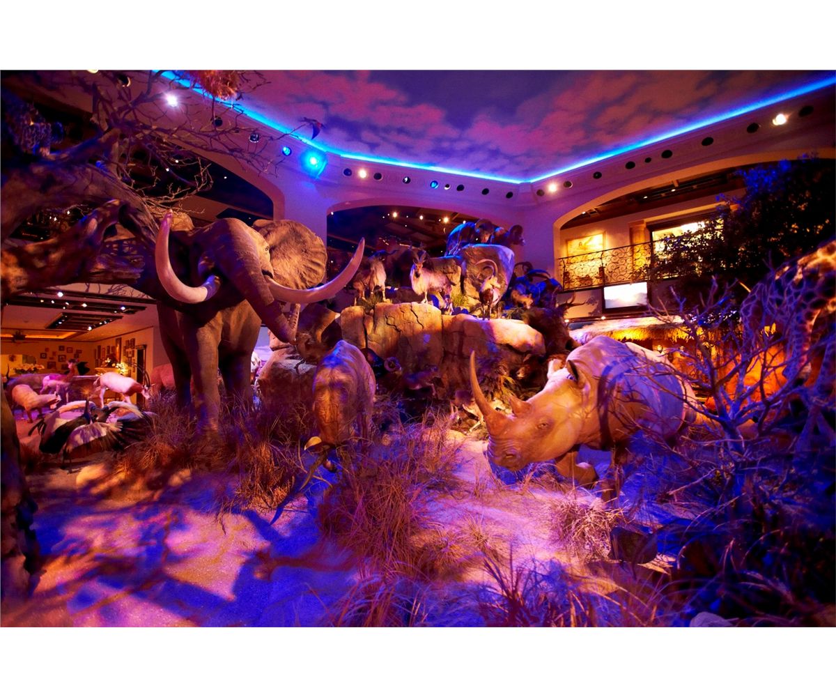 The following day, tour the Cabela home with Mary as your guide and listen to the stories that inspired Dick and Mary to build this dream home. Hear the echoing sounds of the wildlife as you roam through the Rainforest to the South Pacific, meanwhile a rain storm moves in, complete with crashing lighting and thunder that gives your heart a skip and for a moment you forget you’re inside. The trophy room encompasses 15,000 square feet, featuring mountains, caves, authentic trees, more than 500 animals and 300 birds, waterfalls, a swimming pool/lagoon, a changing sky full of stars at night and billowing white clouds during the day. Throughout the home each room has been designed to fit into the overall theme, with woodwork by master craftsmen, Julian and Sons. The entire home breathes through indigenous artwork, as well as paintings and sculptures by such world-class artists as John Banovich, Guy Coheleach and Doug Van Howd. The Cabela home has to be seen to believe it. It is more than a trophy room, even more than a house. It is a dedication to the outdoor traditions to pass down to future generations. After the tour, enjoy cocktails and a catered dinner there at the home.