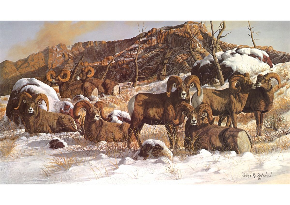 Donation: Bill Poole hunted Wyoming Area #3 with the retired Cody country outfitter Don DeCastro and took a fine Wyoming bighorn. High in the North Fork near Swede Creek they glassed these nine stunning rams, which included Bill’s ram and his eight bachelor buddies. After the successful hunt DeCastro drew a pencil drawing of the scene and surroundings, which Gary used as reference to create this beautiful special commission for Bill and Ingrid. This beautiful 26”x40 Original Oil on Canvas is not just a one of a kind...it was made from two men that left a legacy. Gary Swanson a man with vision and talent that loved to step into the scene and put it on canvas...and William “Bill” Poole a man of passion for the hunt, so much so, he was the recipient of the Conklin Award in 2008 for his amazing life and many hunting adventures. Enjoy this beautiful painting and the memories that it was imagined for!