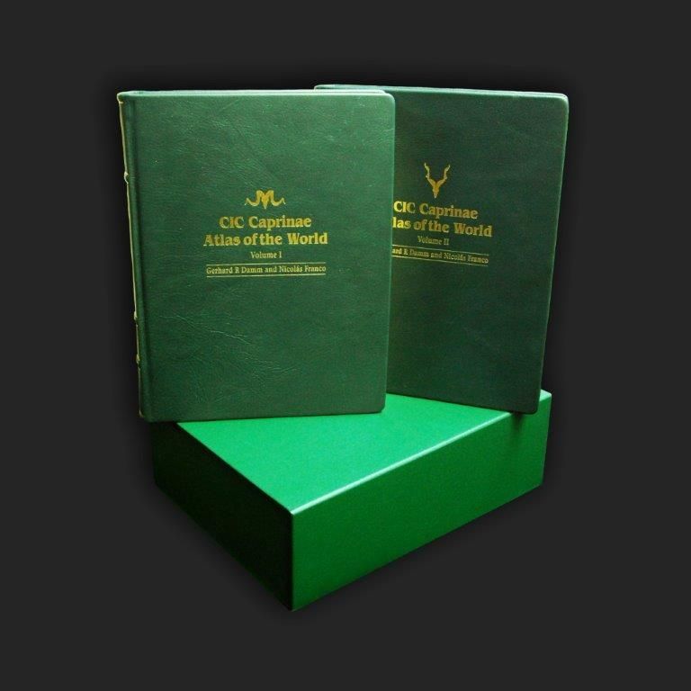 Donation: This exclusive leather bound Sponsors’ Edition of the Caprinae Atlas is one of only fifteen handcrafted and cased sets. Beautiful to behold and unique, it will be the center piece of any library and the purchaser will be in royal company! On September 19th the authors Gerhard Damm and Nicolas Franco, both Life Members of WSF, presented the #1 set to His Majesty, King Juan Carlos I of Spain at the Zarzuela Palace. His Majesty, who also wrote the Prologue to the Atlas, was extremely pleased with this “Magnificent Book”. The two-volume CIC Caprinae Atlas of the World describes 96 Caprinae phenotypes, contains 130 detailed, full color distribution maps and more than 1000 color photos from the wild and from collections of important museums in North America and Europe. The monumental work highlights the importance of science in connection with sustainable hunting and achieves the all-important conservation connection of field research, effective management, community involvement and sustainable hunting. Bodo Meier, a well-known German aquarellist, was specially commissioned to illustrate the dust covers of the standard edition of the CIC Caprinae Atlas of the World with a watercolor painting of a Pamir Argali group and a group of magnificent Kashmir markhor. The paintings are also lithographed as frontispieces in the Collectors’ and Sponsors’ edition of the Caprinae Atlas.