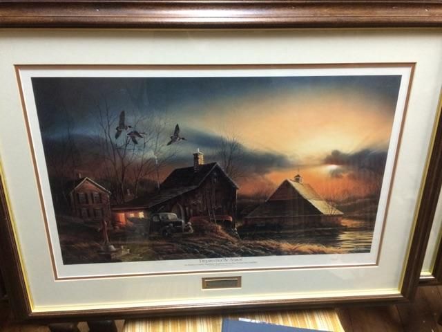 Terry Redlin is truly one of the country's most widely collected painters of wildlife and Americana. This 34” x 25” matted and framed 1986 print is from a personally signed open edition by Terry Redlin and donated by Laurie Schiavone, wife of the late Cook Schiavone of AutumnWood Outfitters. In this print we see that hunting and fishing activities have been a tradition with this farm family. Three deer racks decorate the barn wall. Beneath, the fishing boat and canoe patiently wait for spring. But today attention is on the opening of duck season. The Dodge pickup is loaded with a homemade duck boat and wooden decoys. Last minute plans are reviewed in the nearby shed. Then, as if to officially signal both, the beginning of an annual ritual and the end of a truce, three mallards break the still air in a final flyby.