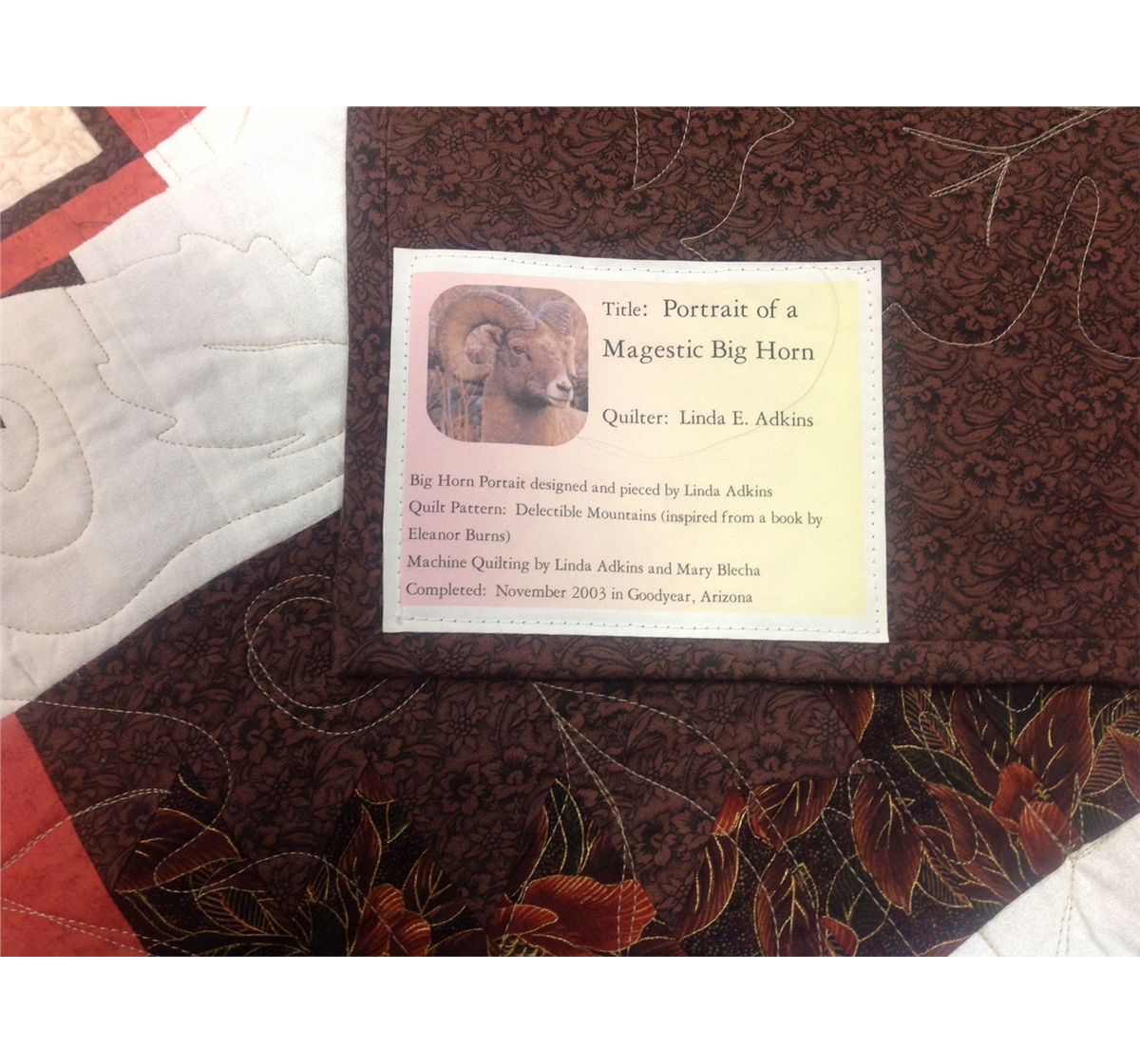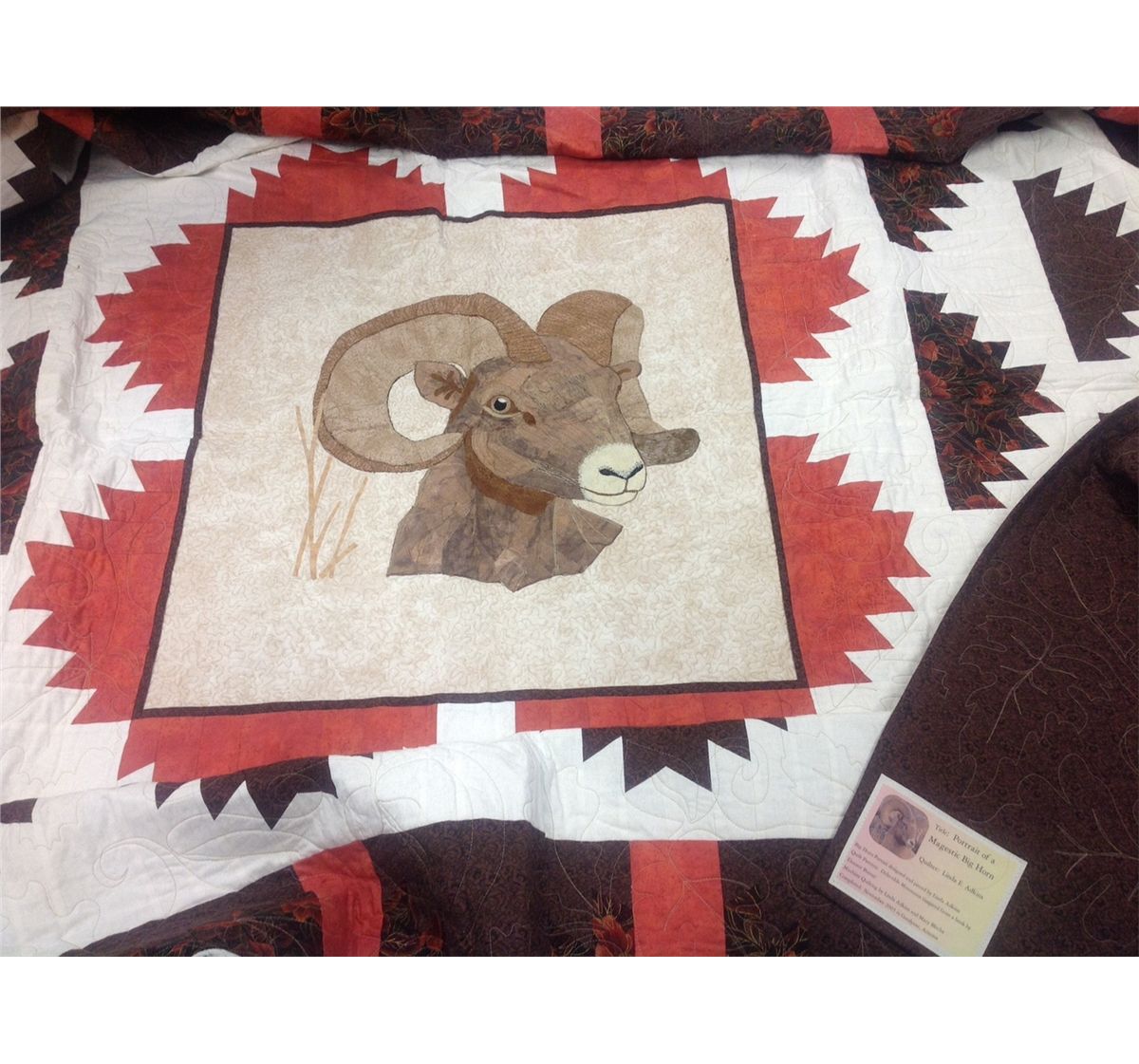 Here is a great piece that would make a wonderful and unique gift for that special lady. This queen size quilt donated by Sandra Fields is designed by renowned quilter Linda E. Adkins. The quilt titled “Portrait of a Majestic Big Horn Sheep” is a beautiful quilt that surely would turn into a family heirloom. The time and work that goes into a quilt like this is unimaginable. It truly is a piece of art. Thanks to Sandra for this wonderful donation and for your continued support of our Eastern Chapter.