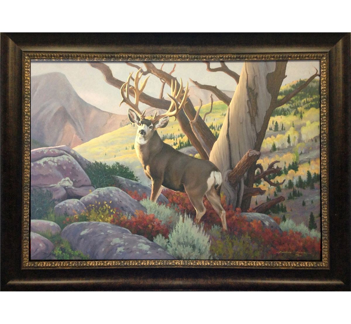As fall surges on the peaks of the Tushars, dreams of what might be fill our thoughts. We become once again as children before Christmas. This is the time of year we live for. As you glass the slopes across the canyon this buck materializes, his antlers shining in the sun. You watch him as he disappears over the slope. Is this the first and last time you see him? Who knows, but one thing is for sure, you'll be back looking for this buck of a lifetime. Randsom has been painting professionally for over 20 years and is very well known for his depictions of mule deer and elk throughout the west. This is an exceptional piece of art to enhance your private collection and help fund big game conservation.