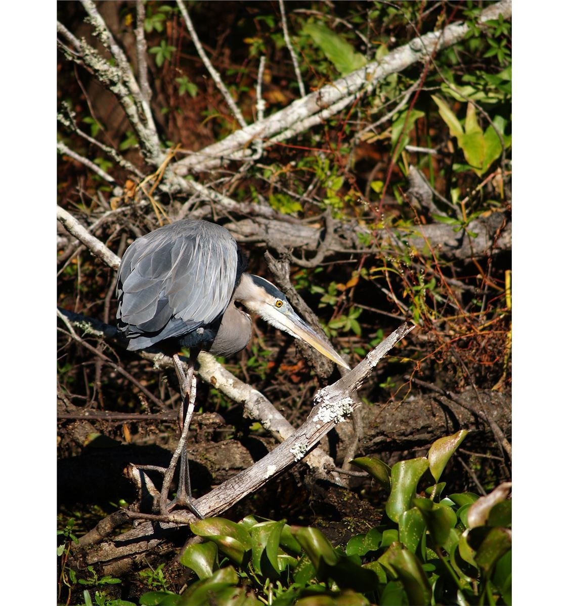 Photograph of great blue heron in a wild swamp printed on aluminum. By Artist, Colleen Phillips