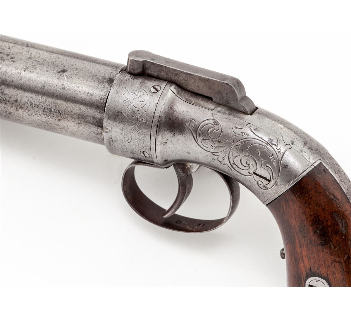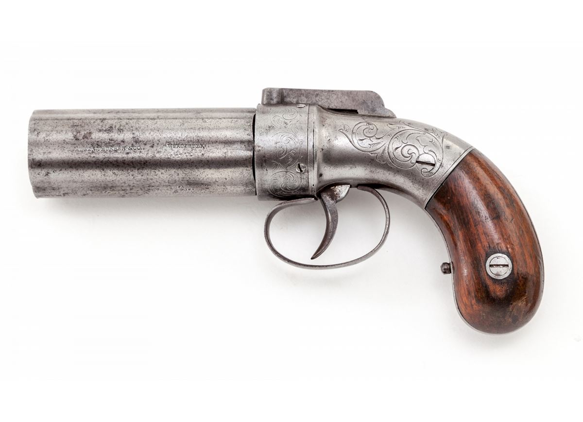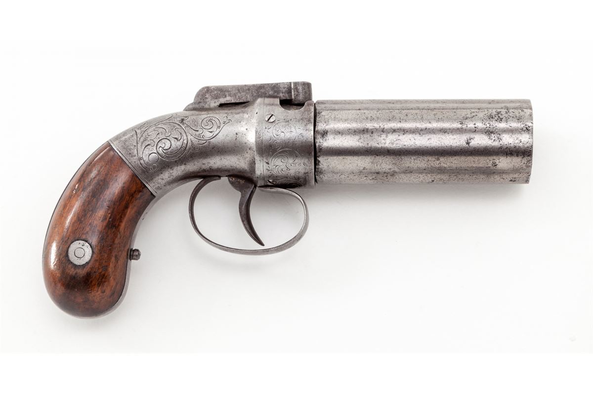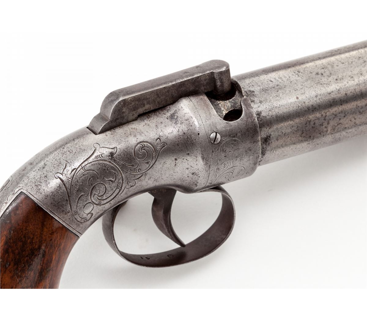 Allen & Thurber Pepperbox Pistol, #41, .31 cal., 3-1/8'' barrel group, originally blue and case hardened finish with light foliate engraving, bag-shaped walnut grips. This particular standard-size version features smooth contoured barrels and nipple shield to upper right side of frame. Barrels are marked ''Allen Thurber & Co. Worcester/Patented 1845''. Condition is about fine with little original finish remaining, mostly to barhammer and trigger. Bag-shaped grips with minor losses of varnish and oil darkening. Good functioning action, with crisp engraving; bores are very good. Est.: $1,500-$2,000. (Antique)