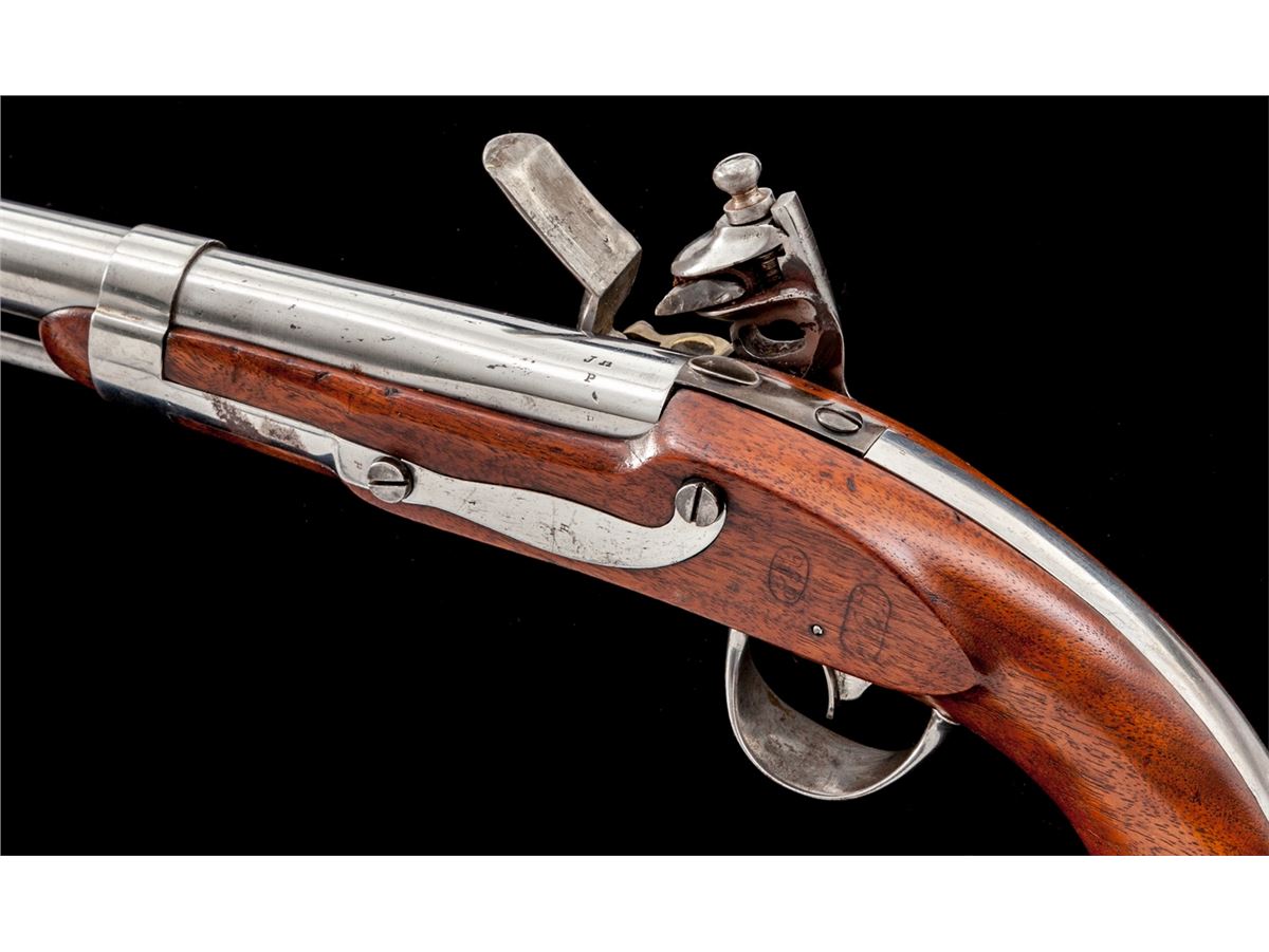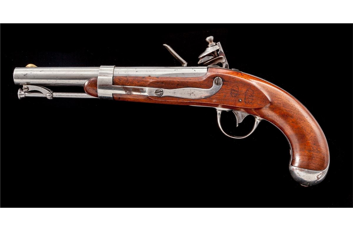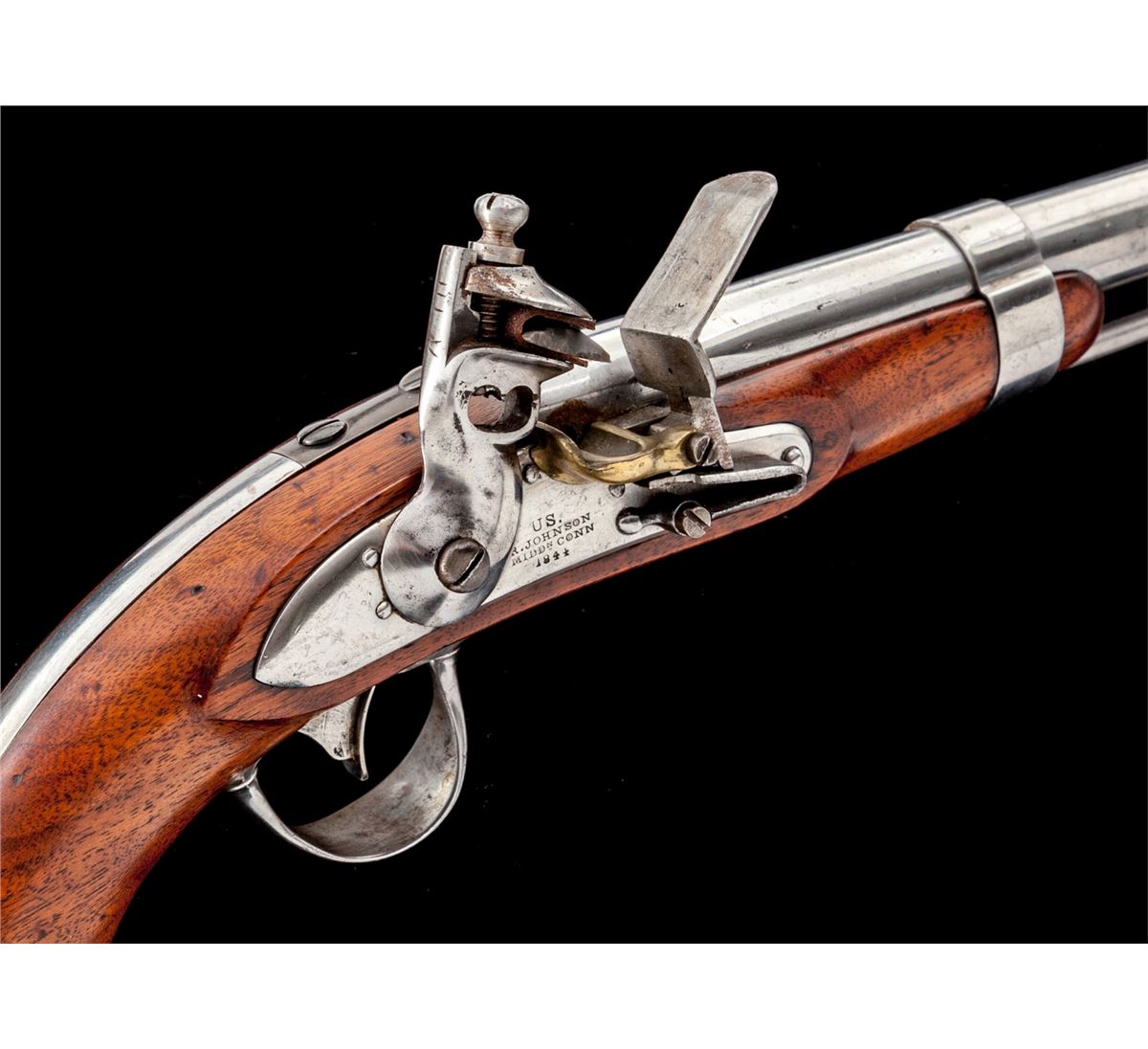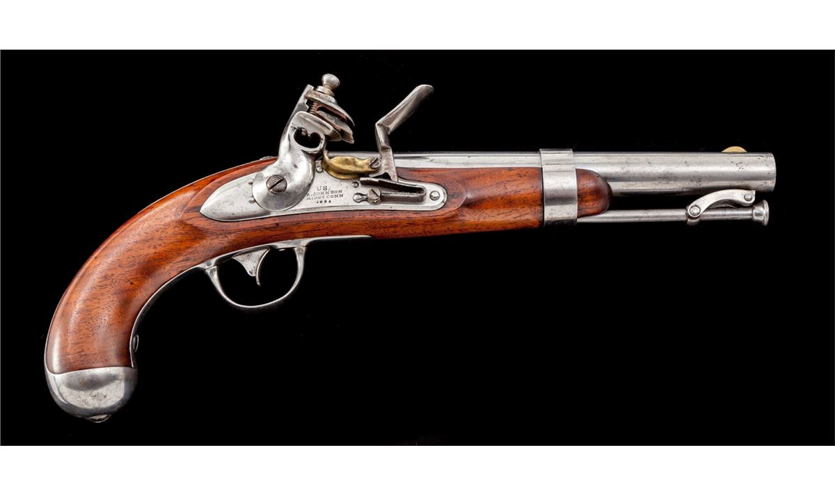 U.S. Model 1836 Flintlock Pistol, by R. Johnson (Middn Conn 1844), NVSN, .54 cal., 8-1/2'' round barrel, correct brass blade front sight, swivel type ramrod with button-shaped head, and double cartouched walnut stock. Considered scarce with Johnson variations mfg'd between 1836-1844 making for only 8000 examples. Condition is fine as partially cleaned, with crisp markings, clearly visible cartouches, good functioning action, and bright smoothbore barrel. Lot also includes a receipt dated 1964 from The Powderhorn in Wilmette, IL. Est.: $1,800-$2,400. (Antique)